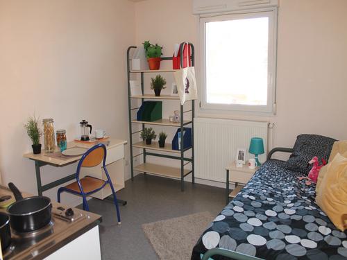 Studio comprenant kitchenette, lit simple, bureau, salle d'eau avec lavabo - wc - douche. Espace de rangement.