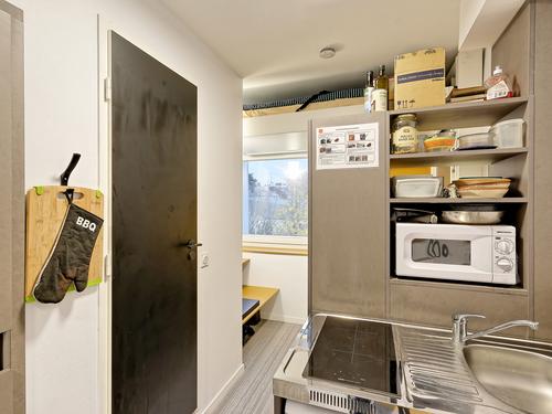 - Équipements : Pièce à vivre, WC, Douche, Evier + plaque, Frigo, Micro-onde
