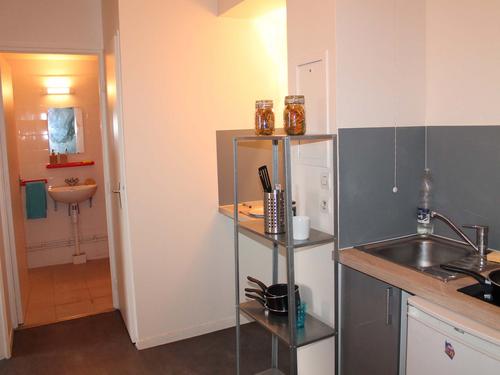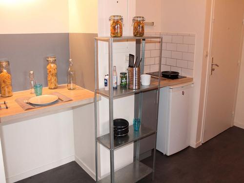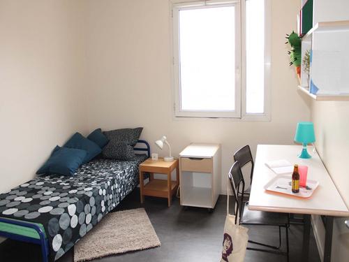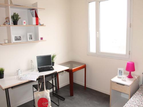 Logement en colocation comprenant : deux chambres individuelles fermant à clef de 10 et 15 m² environ avec lit, bureau, table de chevet, lampe de bureau, chaise et placard avec penderie , salle d'eau commune, wc commun, cuisine commune avec frigo, rangement bas sous-évier, plaques vitro céramique, plan de travail.